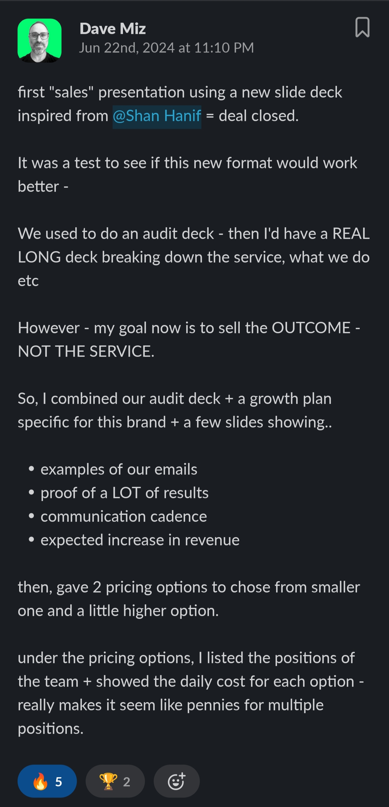 "The 1-1 call with Shan was awesome, he shared one idea for us on a pricing level that was just a game changer for us, we were struggling how to grow profits , didn't know what else to go and he gave us a real clear way to do that”