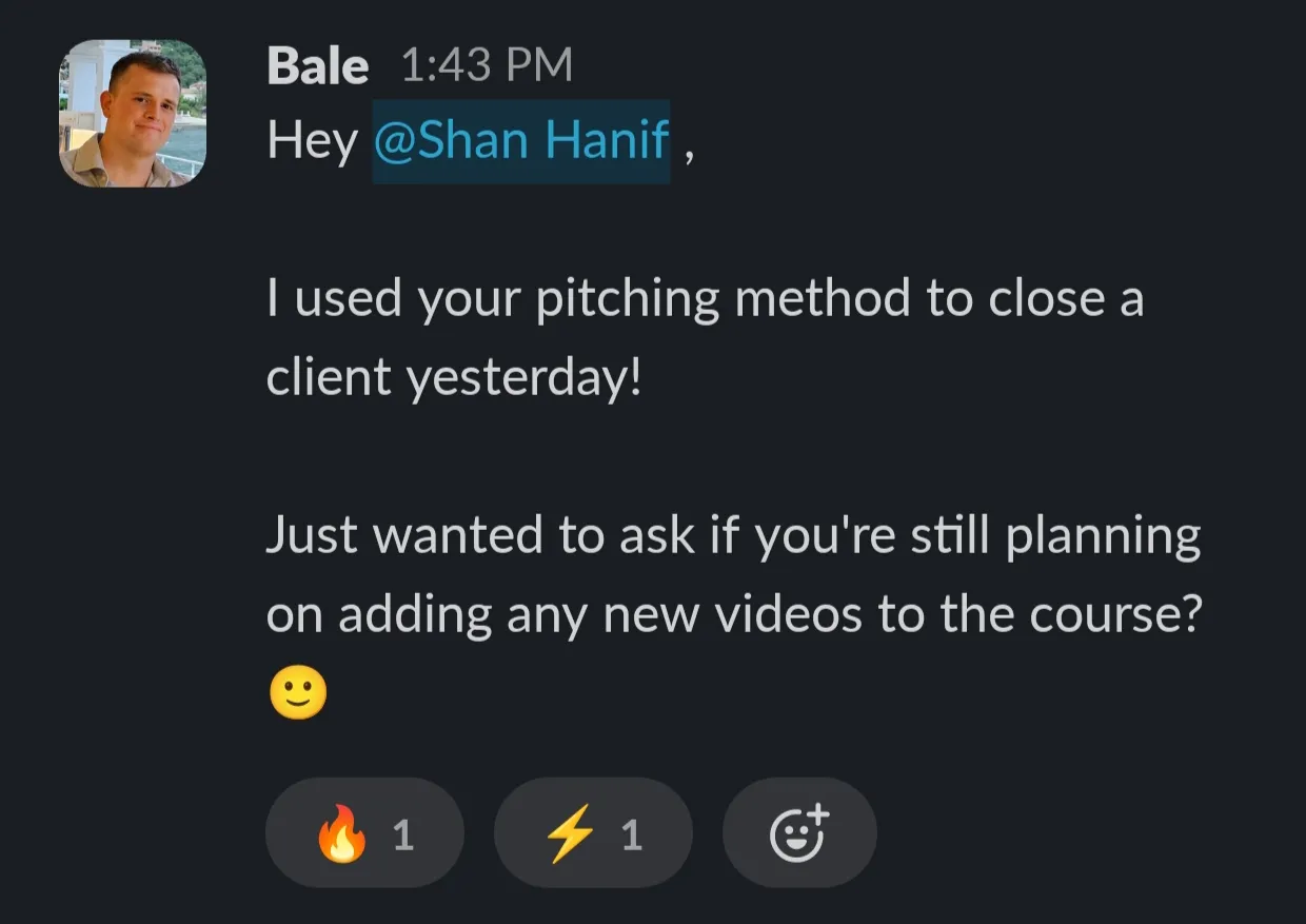 "It's a fantastic course, the most advanced agency strategy content I have ever seen, they teach everything they are doing and extremely relevant to what I was looking to learn, from onboarding, outreach, proposals and we are now charging more then ever before"