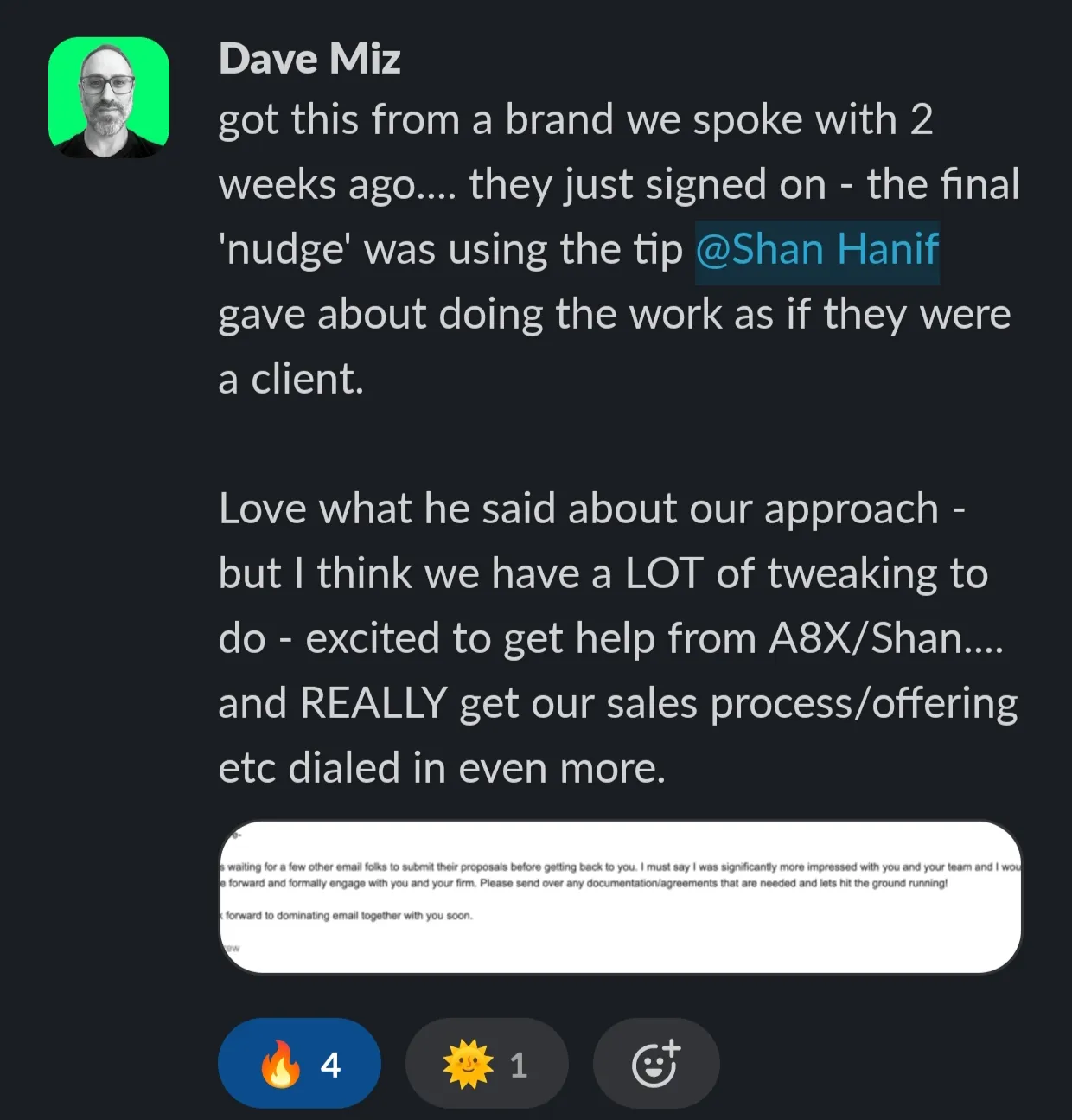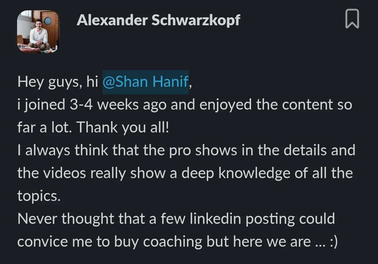 "The biggest thing for me that has provided me the most value is having access to the resources, templates and the actual experiences of Shan and the team, I have signed a client every Friday since I joined"